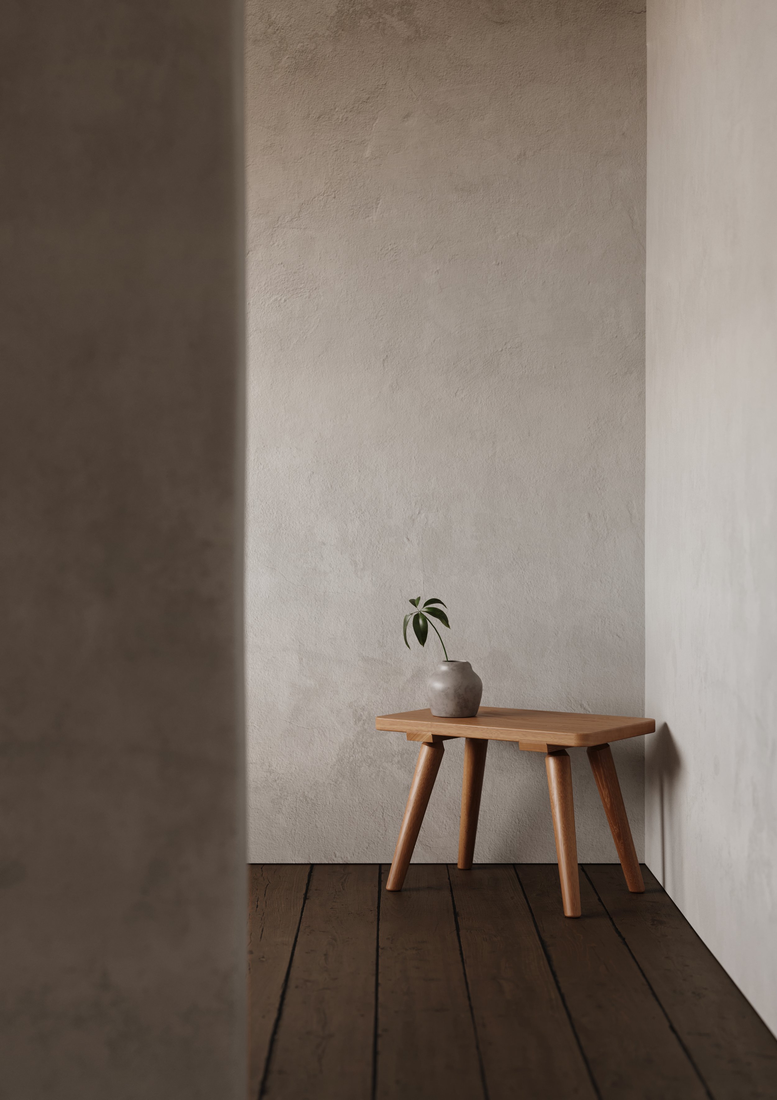 The Shaken Stool carries the same design language and construction principles as the Shaken Table and Bench, distilled into a compact and versatile form. Its simple silhouette and balanced proportions make it easy to place throughout the home, whether used as extra seating, a small side surface, or a functional accent piece.