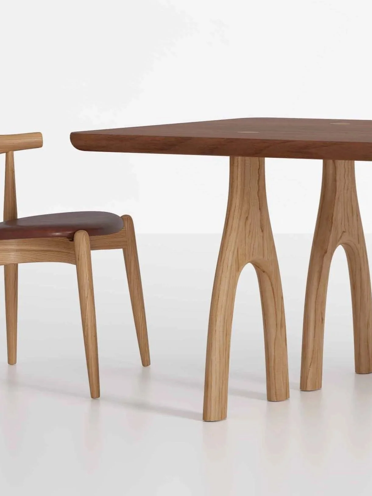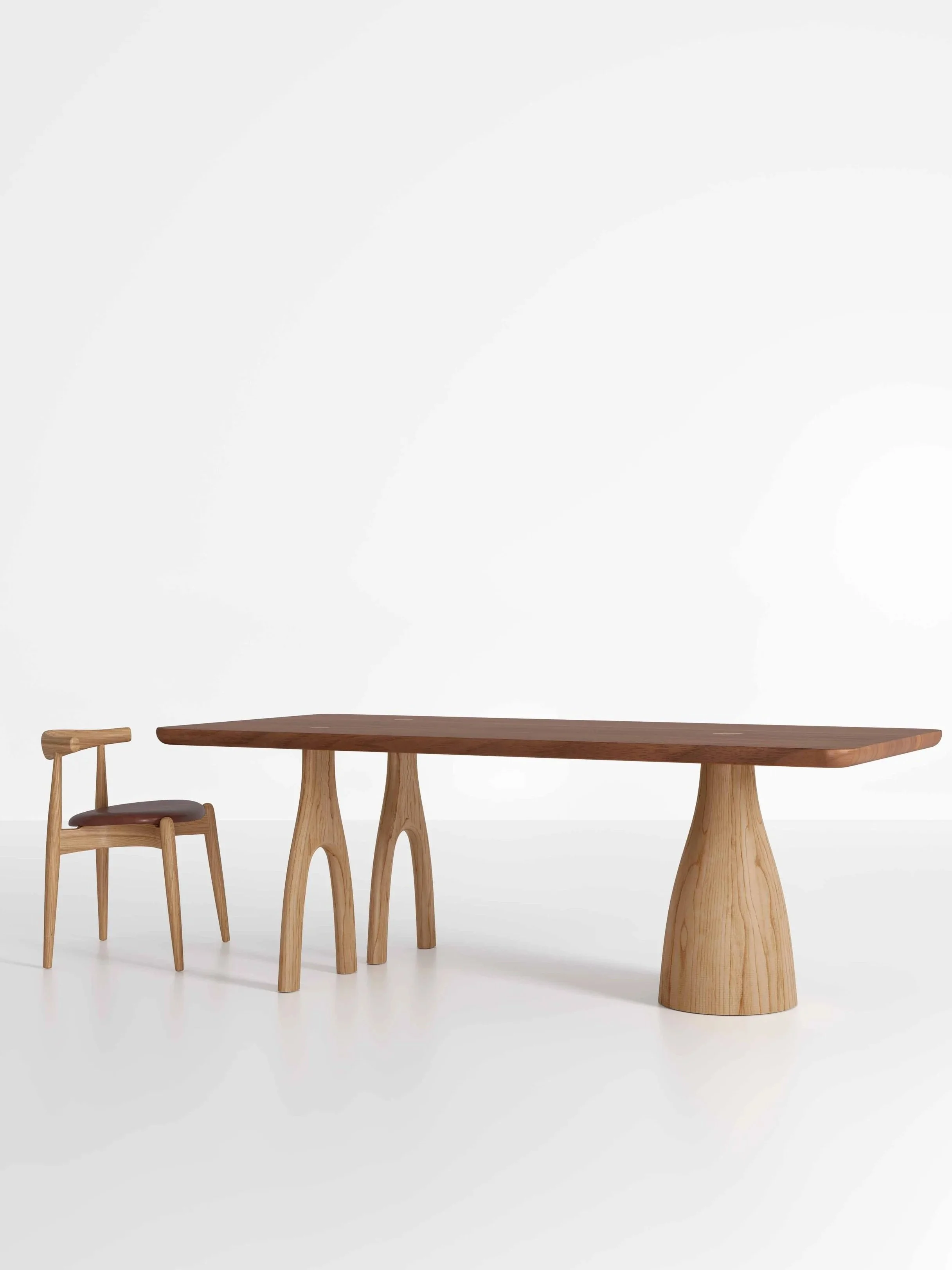 The design is defined by its distinctive base. One end of the table rests on a solid pedestal leg inspired by the form of a mezcal bottle, while the opposite end is supported by two sawhorse-style legs. These legs follow the same curved silhouette as the pedestal, creating a consistent visual language while introducing a subtle asymmetry to the structure.