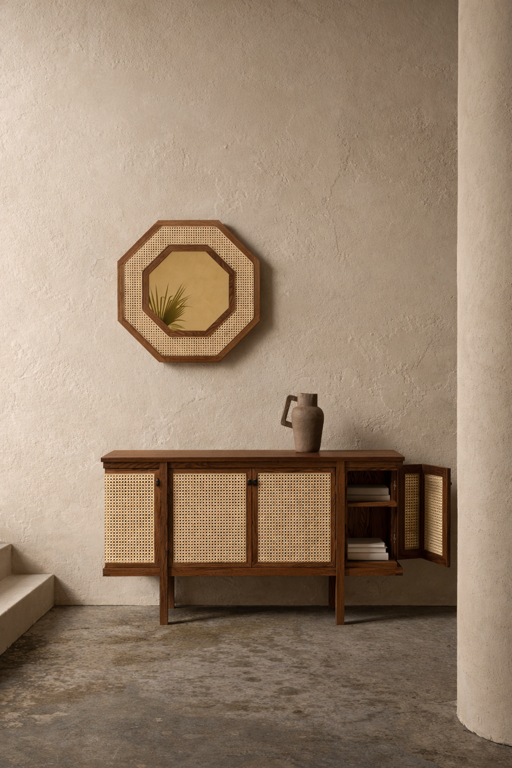 Built in solid wood and detailed with rattan panels, the credenza balances structure and lightness. Its clean lines and straightforward proportions emphasize function while allowing the natural materials to remain central. The rattan softens the piece visually, creating contrast with the solidity of the wood frame.