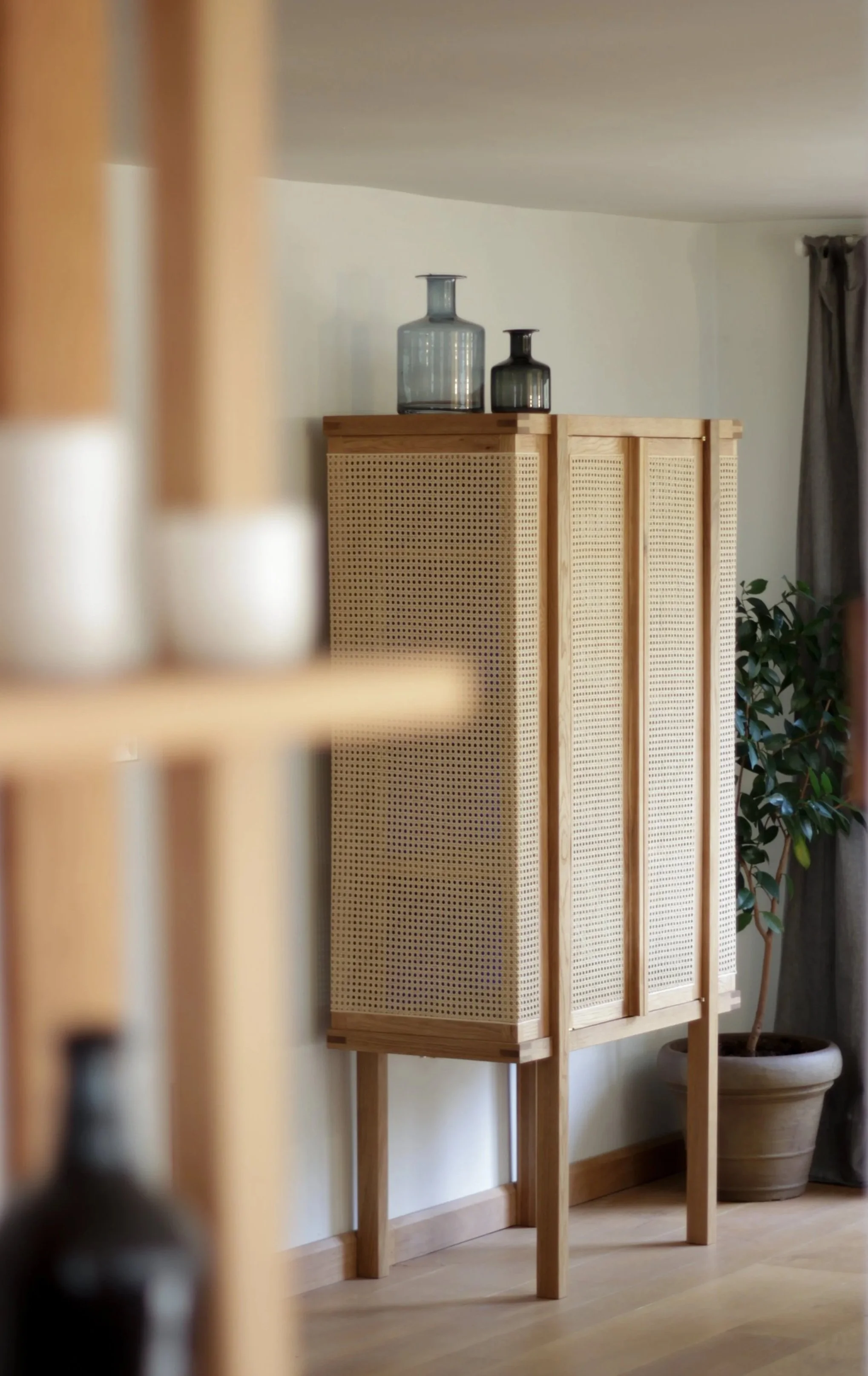 Built in solid wood and detailed with Rattattan panels, the cabinet balances openness and enclosure. Adjustable interior shelving allows for flexibility, while the panels soften the structure, filtering light and adding depth without fully concealing the contents. The design encourages a thoughtful, curated approach to display rather than visual clutter.